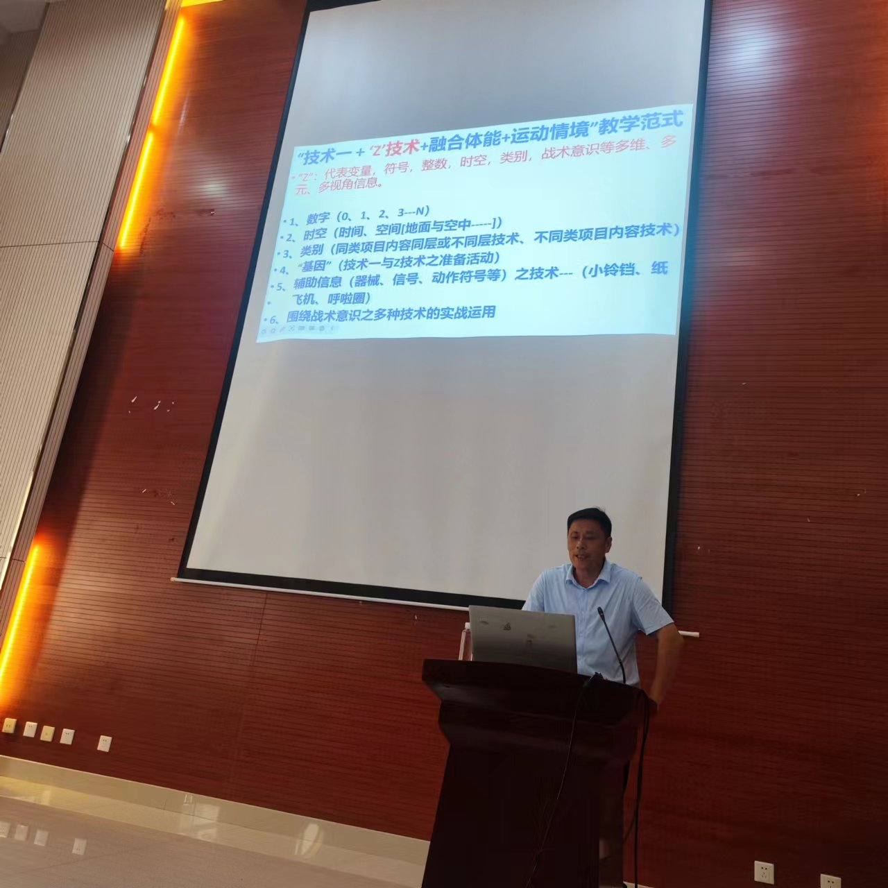 专题辅导陈老师围绕“Z”技术的内涵与现实课堂拓展,从数字、时空、类别、基因、辅助信息、围绕战术意识之多种技术的实战运用为主要特征,从田径、篮球、足球、排球、武术、体操等各个项目的实际运用,进一步解析技术一、“Z”技术、融合体能三者在特定情境下如何灵活运用于课时、单元、模块教学计划的范式与灵活运用实践案例进行了分享。