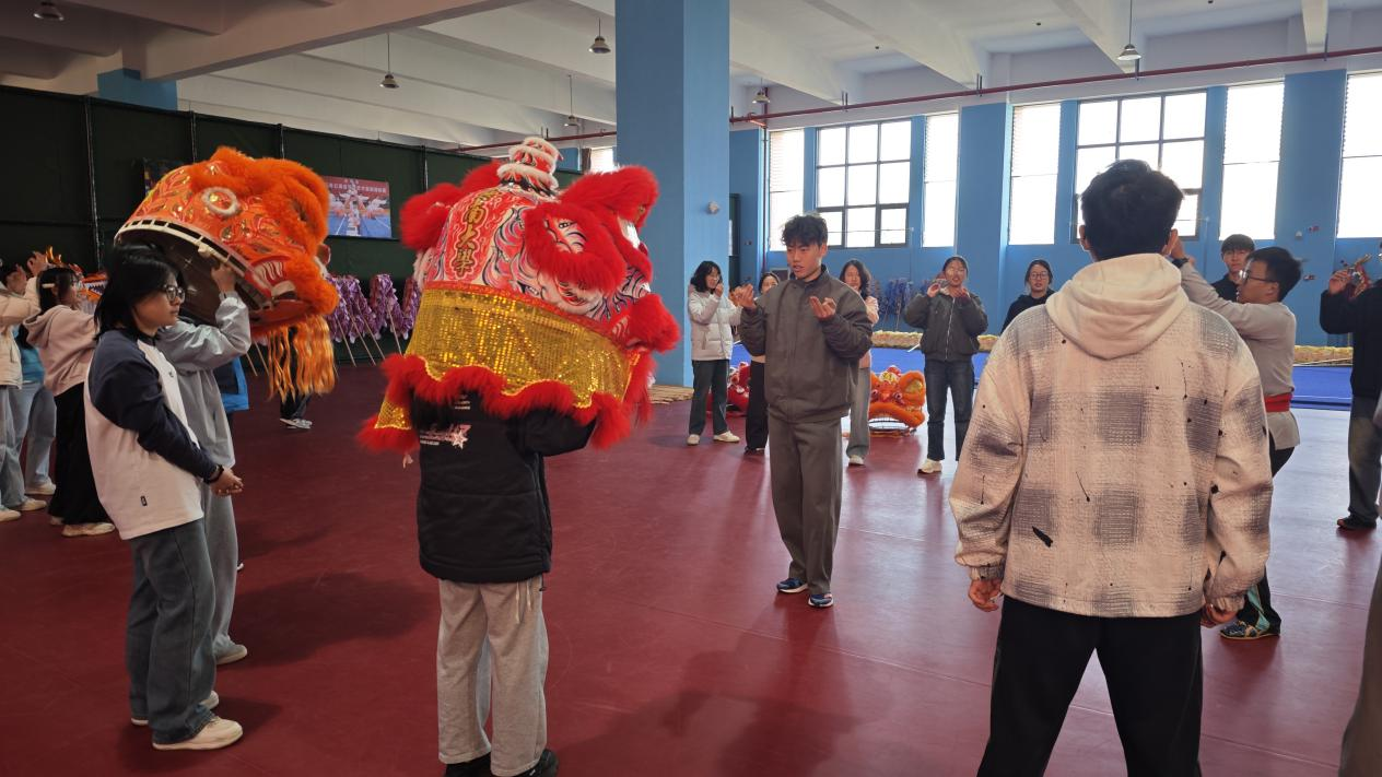 表演结束后,协会成员为同学们讲解了龙与狮的文化渊源、动作寓意及基本技法。随后,参与者分组进行体验:舞龙组手握龙杆,学习“8字舞龙”“螺旋跳龙”,在配合中感受协同的力量;舞狮组戴起狮头,尝试“醒狮步”等基础动作,于起伏的节奏里领悟醒狮的神韵。“没想到狮头这么重,但一起配合起来特别有成就感!”“舞龙真考验默契,可大家心往一处想,整条龙就活起来了!”现场欢笑不断、掌声阵阵,与挥洒的汗水共同汇成活力的乐章。