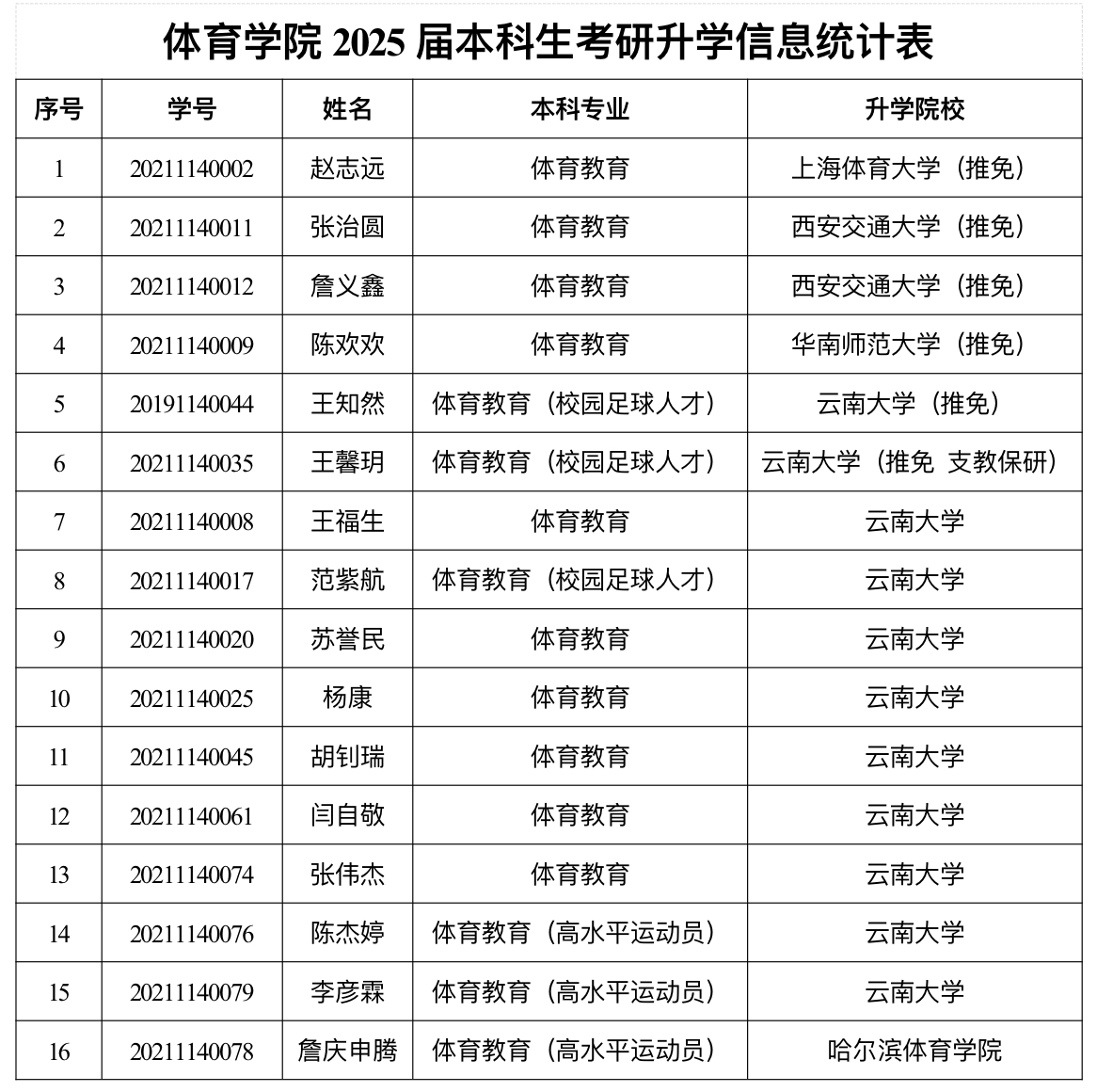 墨研千卷学风劲,鹏举九天捷报连。在刚刚结束的2025年考研升学季中,2026世界杯指定网站交出了一份亮眼成绩单,本科毕业生升学率达21.05%,较去年增长3.33个百分点,实现连续4年稳步提升,其中,报考本校研究生比例达91.07%。升学员工中,被双一流高校和体育专业院校录取比例达到100%,在云南省高校体育专业中位于前列。这一成绩不仅刷新了公司纪录,更展现了体院学子在学业与竞技双赛道上的较大潜力。