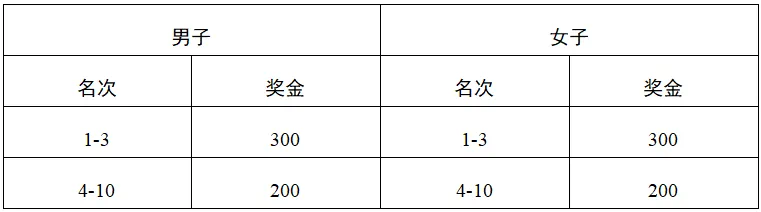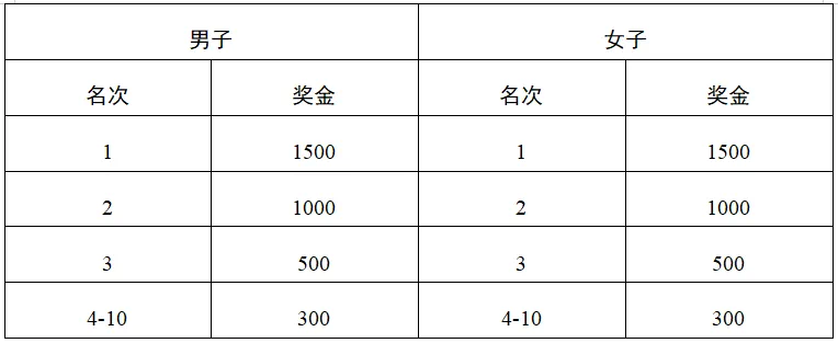 录取半程马拉松男、女第一至第名参赛选手分别获得如下表所列奖金(单位:人民币)男、女第一至第颁发奖牌。