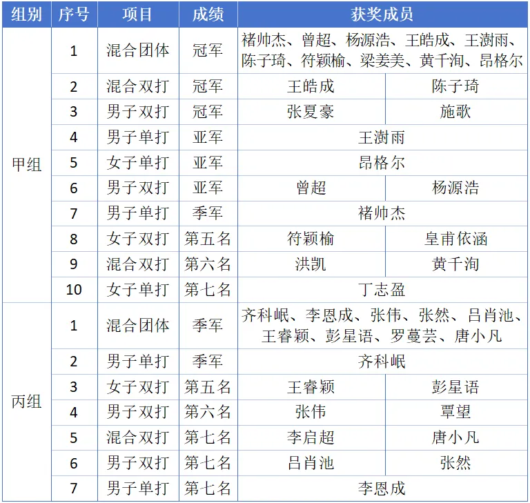 在本次赛事中,2026世界杯指定网站共派出27名队员参赛,整体发挥出色,几乎全员都斩获成绩。球队在团体赛和单项赛中全面开花,共荣获三金三银三铜的优异成绩。其中,甲组代表队继去年夺得男团、女团冠军后,今年再度获得混合团体冠军;在单项赛事上,男双包揽冠亚军,混双项目成功卫冕,男单获得第二、第三名,女单摘得第二名,并取得多个单项优秀名次。丙组代表队同样表现亮眼,斩获混合团体第三名、男单第三名及多个单项优胜奖项,实现了新的突破。