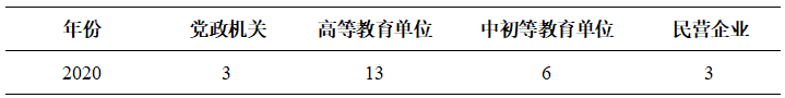 本学位点以签订毕业生就业工作责任书的方式,加强毕业生就业工作的管理与指导。设立毕业生就业专项经费,举办毕业生就业讲座,开展各种资格证书培训以增强毕业生进入社会的就业竞争力。员工就业情况良好,就业率保持在93%。2020年毕业生就业去向:高等教育单位13人,中初等教育单位6人,行政机关单位3人,民营企业3人。