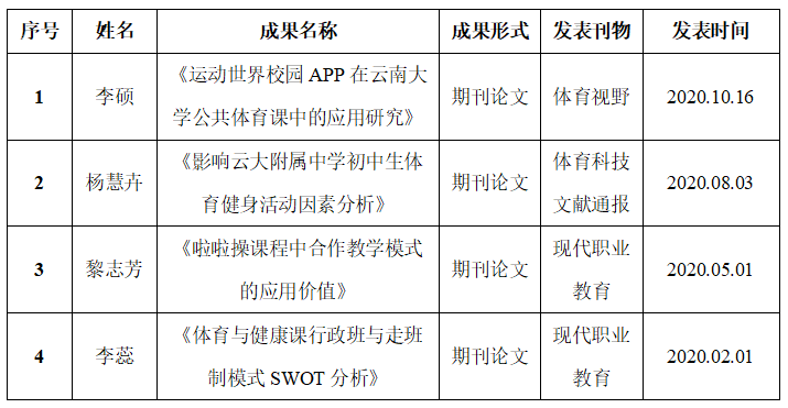 本学位点的教师2020年度共发表11篇论文,在国内学术期刊发表论文10篇,在国际学术期刊发表论文1篇。研究成果及时转化为教学成果,促进了人才培养、科学研究与社会服务的融合发展。本年度,公司教师团队致力于教学与研究工作,取得了系列重要成果,科研立项共计7项,获批科研经费135.5万元,同时,《体育教材教法》《体适能评定与方法》荣获校级思政示范课,将科研成果有效转化为课程讲授,创新教学方法和课程内容,扩大社会影响力。
