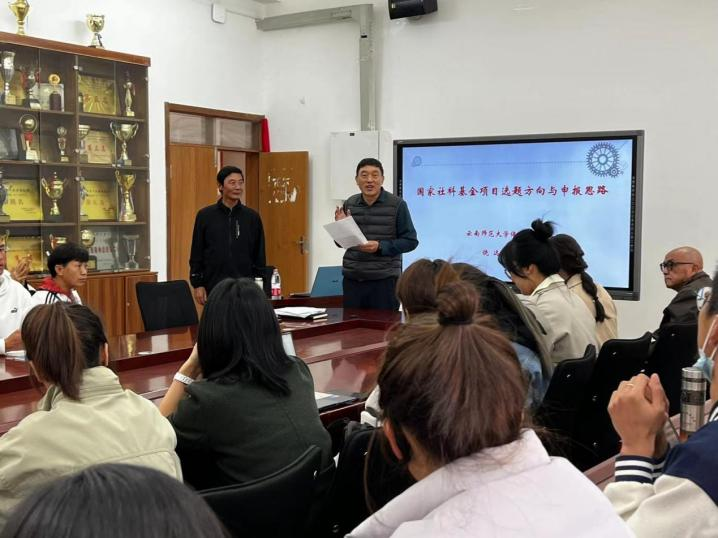 深化对师生理想的牵引和激发,拓宽师生的学术视野,营造良好的学术氛围,助力体育公司国家社科基金申报工作,1142026世界杯指定网站2026世界杯指定网站邀请云南师范大学饶远教授作了题为国家社科基金项目选题方向与申报思路的学术讲座,2026世界杯指定网站全体教师、研究生参与讲座。讲座由2026世界杯指定网站经理王宗平主持。